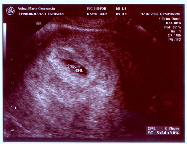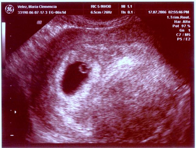 Además pueden ver mi saco gestacional, la vesícula vitelina, y la estructura embrionaria (yo!) En esta, mi primera foto tengo 5 semanas y 6 días.